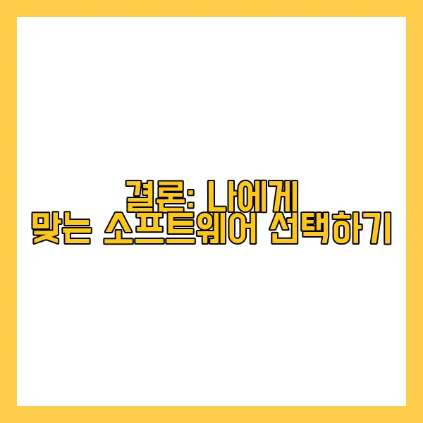 결국 중요한 것은 여러분의 사용 목적과 요구사항에 맞춰 최적의 소프트웨어를 선택하는 것입니다. 사전에 충분한 비교와 조사를 통해, 나에게 필요한 소프트웨어를 효과적으로 결정하시기 바랍니다. 올바른 선택이 여러분의 생산성과 효율성에 긍정적인 영향을 미칠 것입니다.