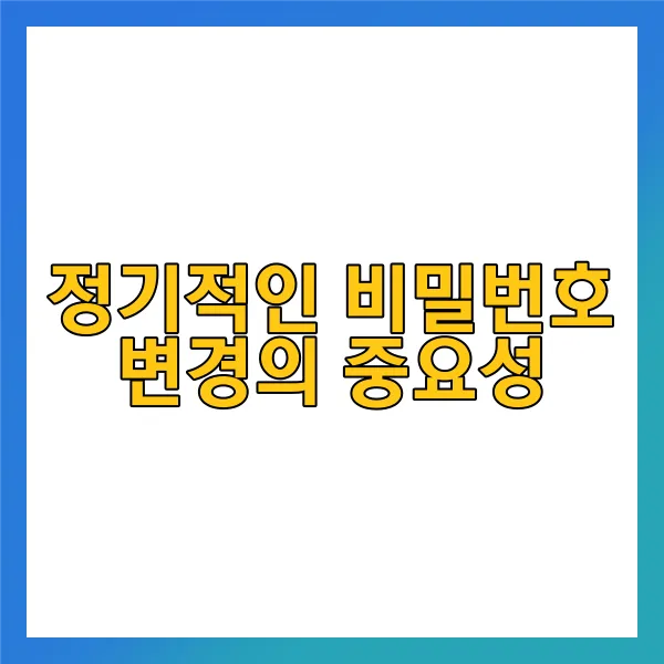 정기적인 비밀번호 변경은 단순히 '안전 관리를 위한 습관'으로 생각될 수 있지만, 이는 사이버 공격자들에게 비밀번호가 유효할 가능성을 줄이는 효과를 갖습니다. 일반적으로 권장되는 비밀번호 변경 주기는 최소 3개월에서 6개월입니다. 즉, 3개월마다 비밀번호를 변경하는 것을 습관화하면, 해킹 시도에 대한 방어력이 크게 향상됩니다.