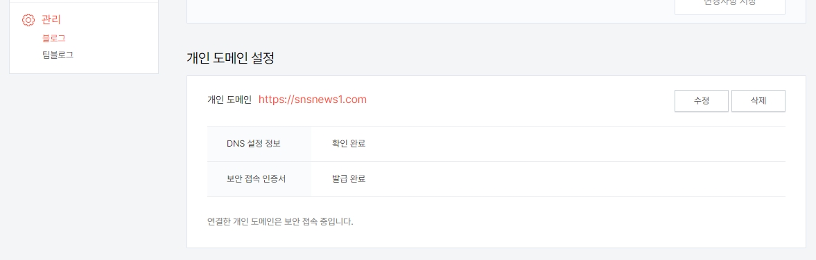 티스토리 관리자모드로 접속해 아래와 같은 화면을 찾습니다. 이후 개인 도메인 설정 항목을 보시면 오른쪽으로 수정, 삭제 버튼이 있습니다. 삭제버튼으로 도메인 삭제 후 바로 다시 연결하고자 하는 개인 도메인을 등록하면 몇 분안에 해결됩니다. 화면 보고 있으면 짜증날 수도 있으니 잠시 딴일 보시고 돌아오면 자신의 홈페이지가 제대로 운영되는 것을 확인 할 수 있습니다.