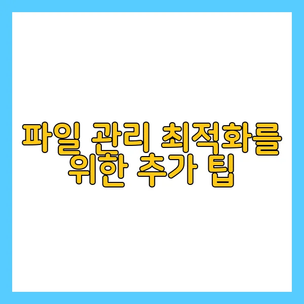 네 번째로, 정기적인 정리 작업을 추천합니다. 경험상, 파일 관리의 최적화는 일정한 주기로 진행해야 합니다. 예를 들어, 매달 마지막 주말에 1시간씩 투자하여 불필요한 파일을 삭제하고, 폴더를 정리하면 상당한 효과를 볼 수 있습니다. 이러한 작은 습관이 장기적으로 큰 차이를 만들어냅니다.